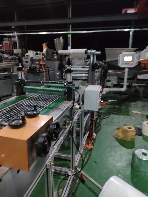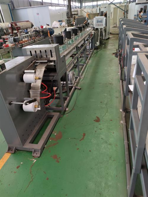 丁基橡膠較為粘稠且柔軟,雙腕關(guān)節(jié)橡膠擠出機(jī)可直接裝入塊狀或卷狀橡膠,橡膠通過供料系統(tǒng)進(jìn)入螺桿機(jī)筒,被加熱塑化,并被螺桿剪切、混合、壓縮,在模頭上形成向前的擠出壓力,然后將其從模頭擠出成所需的片材形狀。產(chǎn)品擠出后被離型紙覆蓋并固定,然后進(jìn)入運(yùn)輸和切割階段。